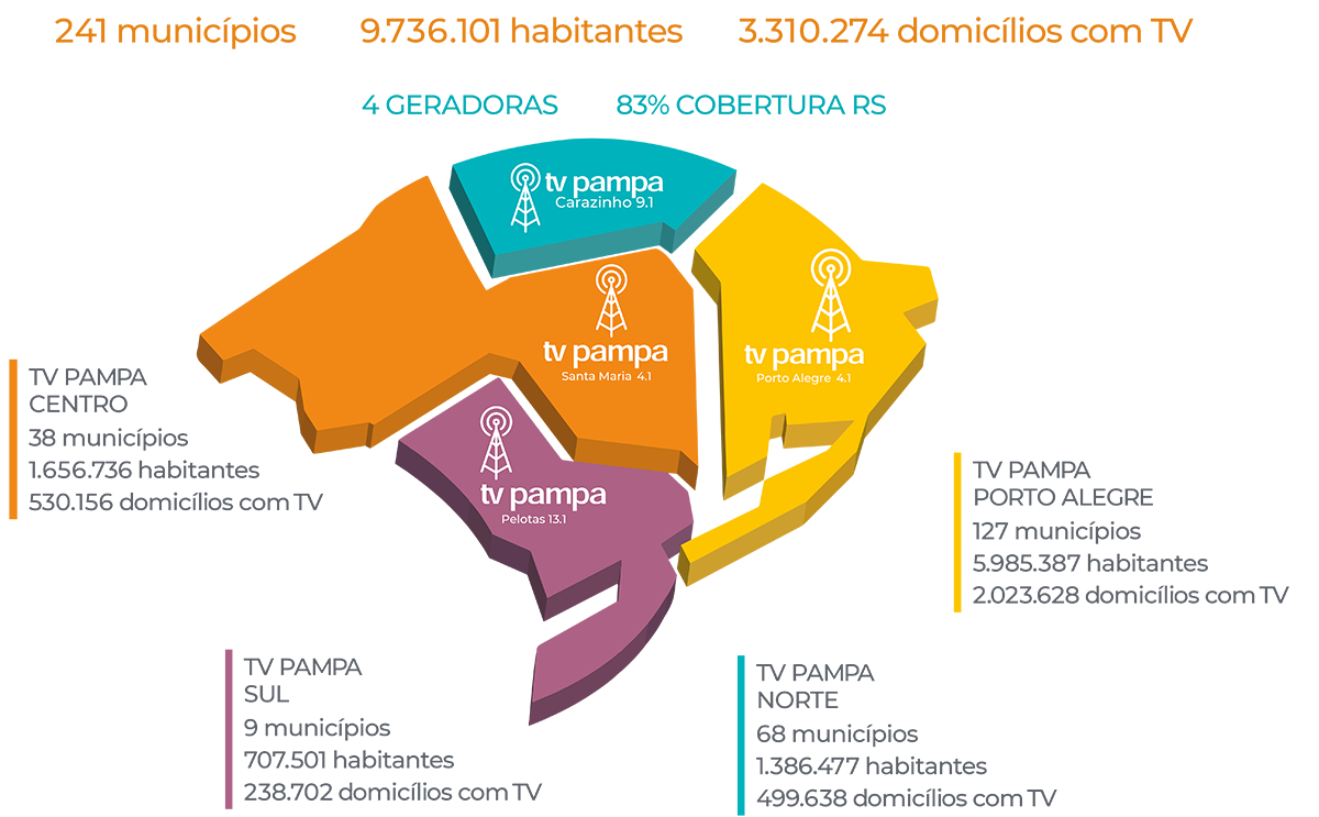 A Rede Pampa de Comunicação, com suas quatro emissoras e mais de cem retransmissoras, atinge mais de 83% da população do Estado, sendo hoje uma excelente opção para atingir o Estado do Rio Grande do Sul com vantajosa relação custo/benefício.